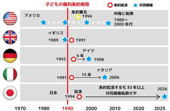 一方、海外では、フランスは1965年まで、ドイツは1977年まで、女性の就労に配偶者の許可を必要とするなど、父権的な法制度が続いていました。しかし1979年、米国で単独親権の問題を扱った映画「クレイマー、クレイマー」を契機に共同親権制度への転換が始まり、1990年の子どもの権利条約の発効前後から、各国は子育ての男女平等を実現すべく、単独親権から共同親権制度へと移行していきました。