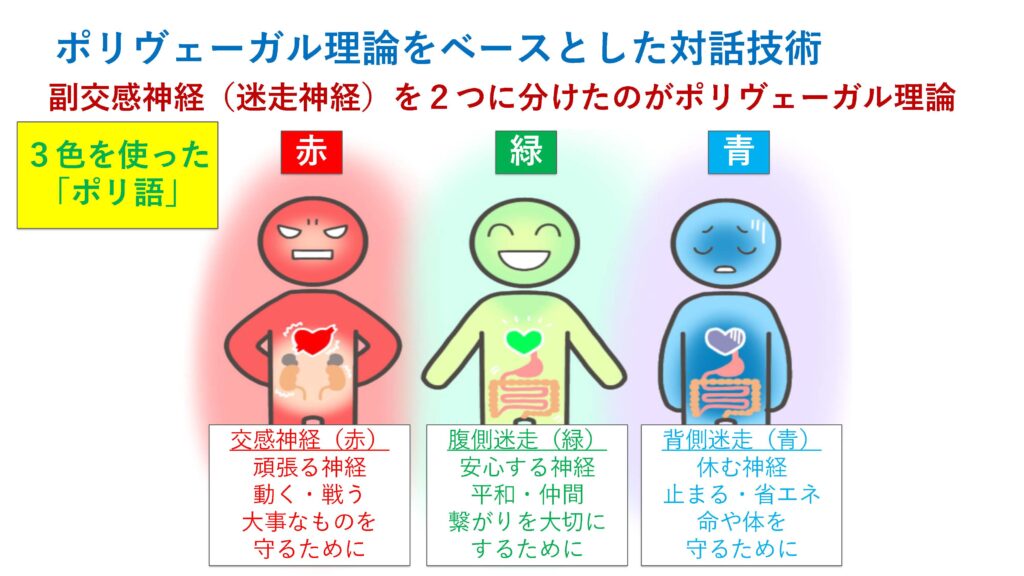 後半では、「父母の子育て意見の相違をどう乗り越えるか」をテーマに、会話や議論ではなく「対話」を増やしていくことの大切さを共有しました。また、ポリヴェーガル理論をもとにした「ポリ語」の三色で自律神経を捉え、日常生活に“緑”を増やす工夫についてもお伝えしました。