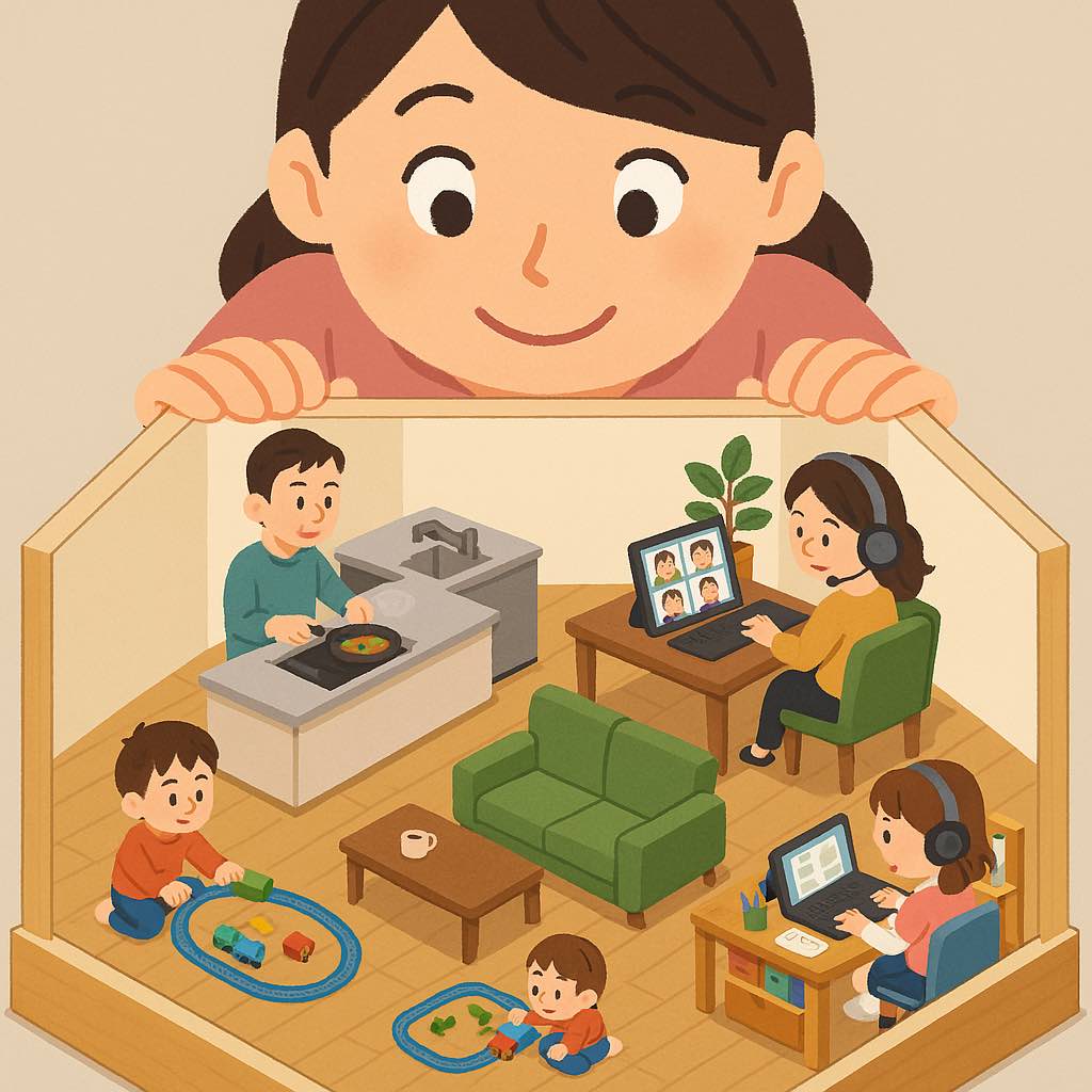 実際の家庭で起きていることを、箱庭の上から覗き込んで分析するイメージです