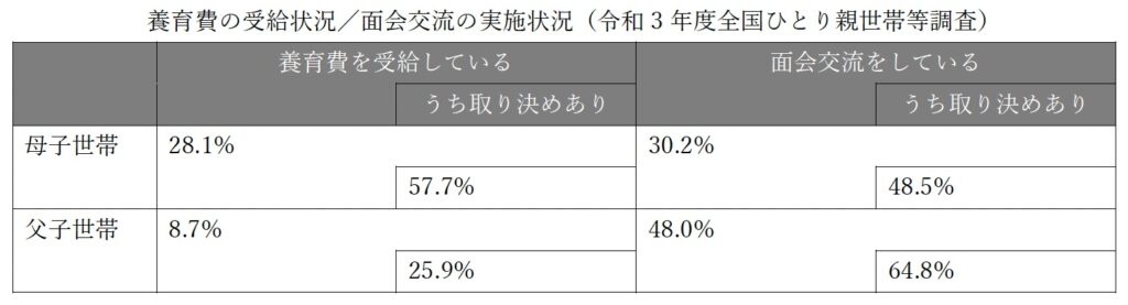 2026年4月から共同親権制度が導入され、離婚後も父母が協力して子育てを担う枠組みが広がります。一方で、取り決めがなされても養育費や親子交流が継続されない現状が課題として指摘されています。具体的には、こども家庭庁令和3年度「全国ひとり親世帯等調査」によると、取り決めを行っても、養育費受給率(母子世帯:57.7%、父子世帯:25.9%)、面会交流実施率(母子世帯:48.5%、父子世帯:64.8%)しか履行されていません。